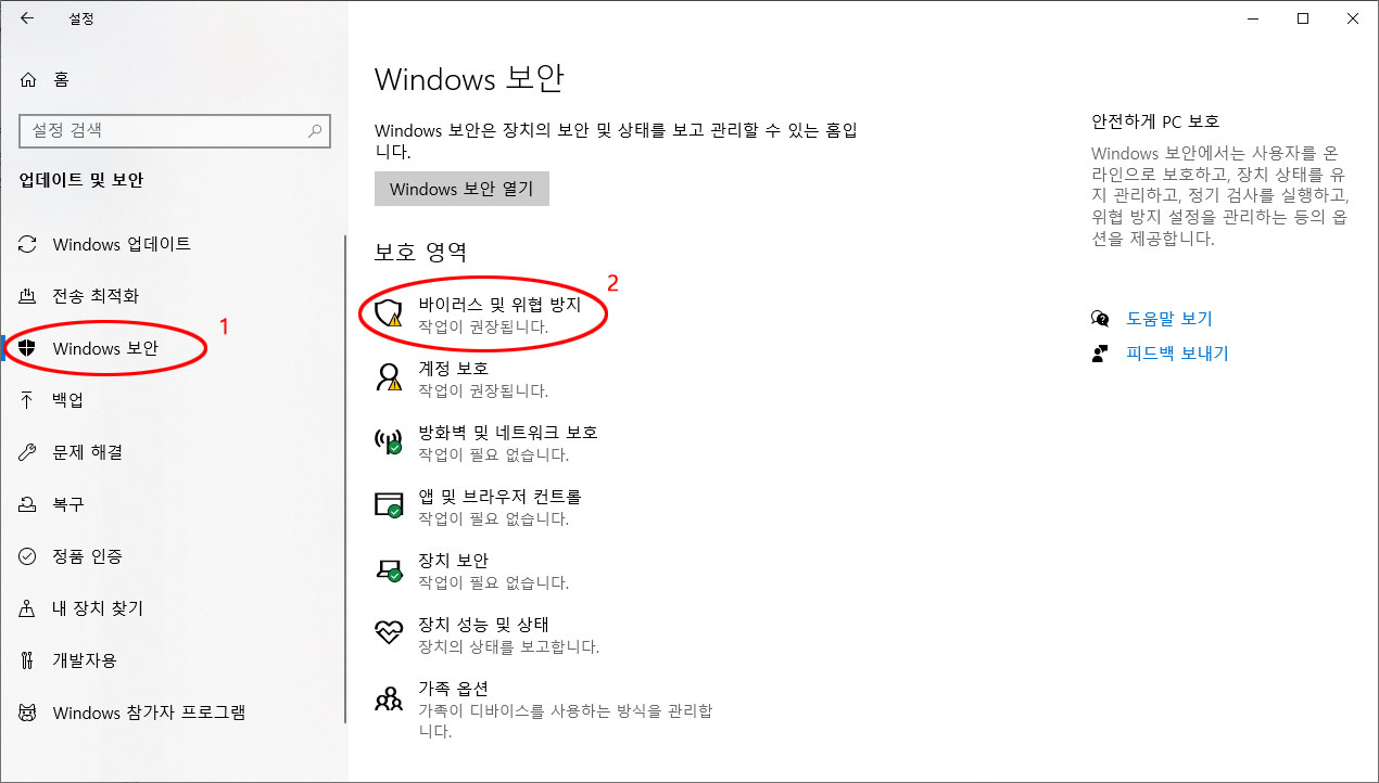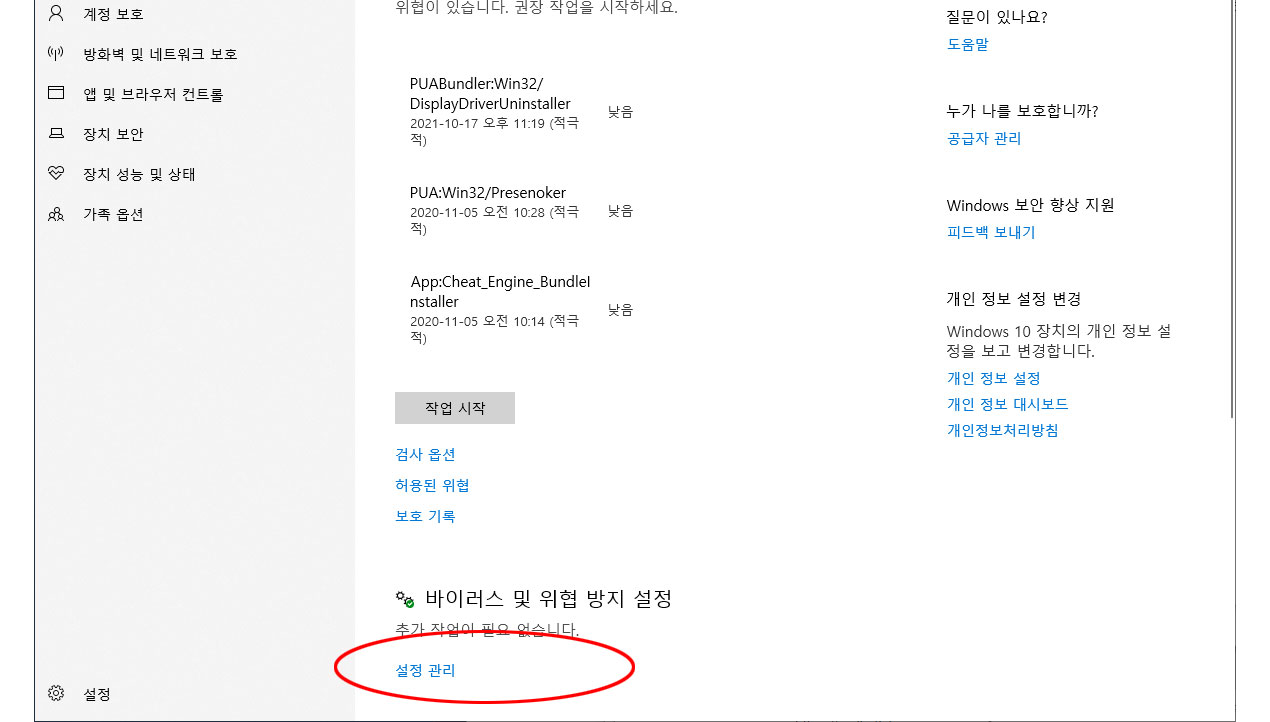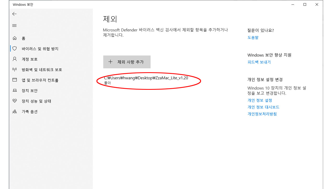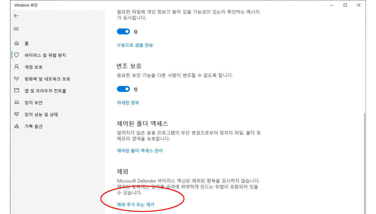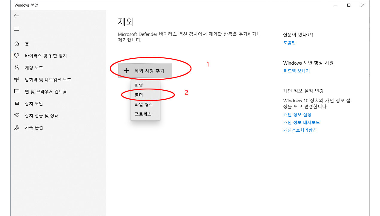 아래는 윈도우 디펜더에서 바이러스로 오인하지 말라는 제외폴더를 지정하는 방법입니다.
